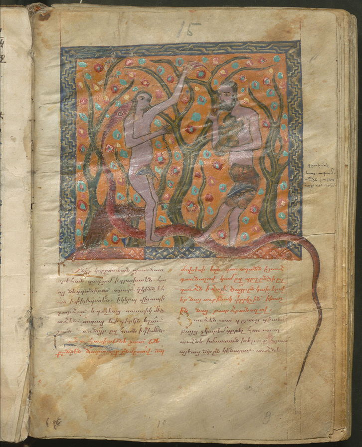 Fig. 1. Adam and Eve with the Serpent in Paradise. Ms Matenadaran 5472, 16th c. (9r)