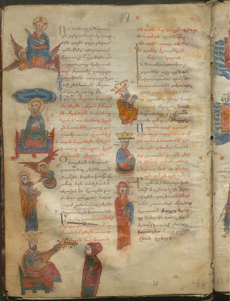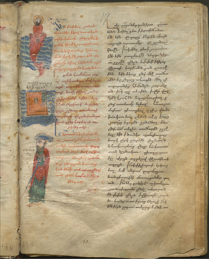 Then the author of the same long kafa mentions Moses’ staff that became a snake (Exod. 7:11), the bronze serpent which Moses hang on a pole (Num. 21:9) — an example of the Word ascending the cross (Jn. 3:14), the story of the serpent deceiving the woman, the fall of the humans, how they died, descended to hell and suffered there until He, the paternal Word, came down and by His Father’s will ascended the cross, bound Satan with it, defeated the Prince of Perdition, took his beloved Adam and raised him to heaven. Enoch, Joshua the son of Nun, Daniel, the four winds and the four beasts, the last of which had evil teeth, are compared with kings Porus and Darius. Other biblical figures and episodes are also referred to. All the mentioned personages (and Aristotle) are painted in Ms M5472 on 3 pages (fols. 10r–11r), with corresponding explanations in the captions (see fig. 2a–c).