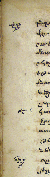 The date of the Armenian translation of Hexaemeron, a poem by the 7th-century Byzantine author Georges of Pisidia, is debatable: scholars’ opinions vary between the 7th and 10thcenturies [Tashean 1901: 321–326]. The reception of this work in Armenian exegetical literature has not yet been sufficiently studied. In their commentaries on the Six-Day Creation, Armenian authors mainly used the Armenian translations of the writings by Philo of Alexandria, Basil of Caesarea, John Chrysostom, and Ephrem the Syrian. Before the time of Nersēs Lambronatsʻi, there existed commentaries on the Book of Genesis by Yeghishe (5th century), Step‘anos Syunets‘i (8th century), Archimandrite Timot‘eos (10th century), and Priest David (10th century), which, along with the works of other Church Fathers, were used by Vardan Arevelts‘i (c. 1198–1271) in his commentary (catena) on the Book of Genesis (MSs M7452, M2604). Vardan Arevelts‘i also cited the Armenian translation of George of Pisidia’s Hexaemeron as indicated by the author’s notes in the margins of the manuscripts (figs. 2, 3).