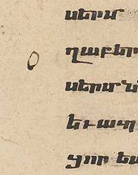 Nersēs Lambronatsʻi’s commentary on the Psalms is structured in a manner typical of the Armenian exegetical tradition: first he quotes a Biblical verse and then interprets it, intertwining his words with the thoughts of various exegetes. In the manuscript we used, quotations from the Bible (fig. 4) and from the works of commentators are marked with distinctive symbols in the margins. The commentary mixes both literal and allegorical methods of interpretation, with the latter prevailing. In the commentary on Psalm 135 presented below, particular attention is drawn to the passage marked with small circle signs (fig. 5). During the course of our research, we determined that either the author or later scribes marked with these signs the beginning and end of the quoted or paraphrased passage from George of Pisidia’s work.