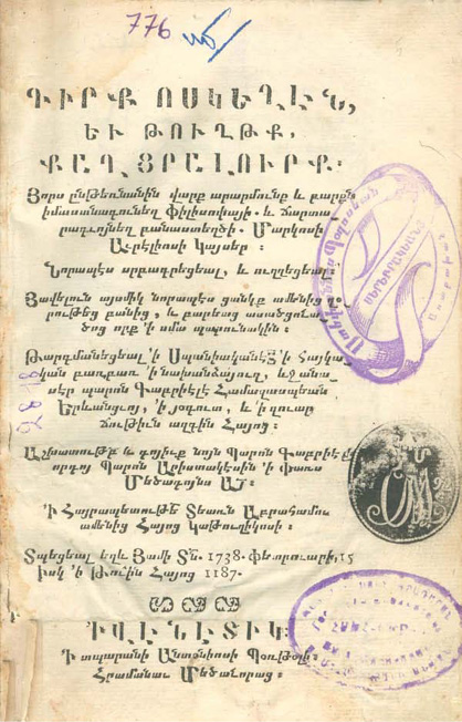 Титульная страница издания [Hamazaspean 1738]. Армянский гражданский шрифт, декоративная заставка; владельческие пометы и библиотечные штампы.