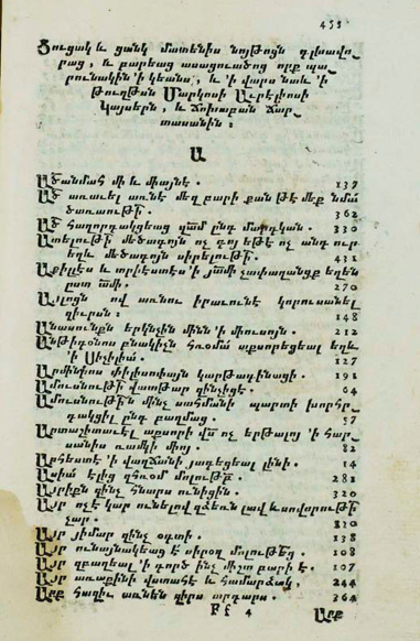 Страница издания [Hamazaspean 1738: 455], предметный указатель тем с данными
